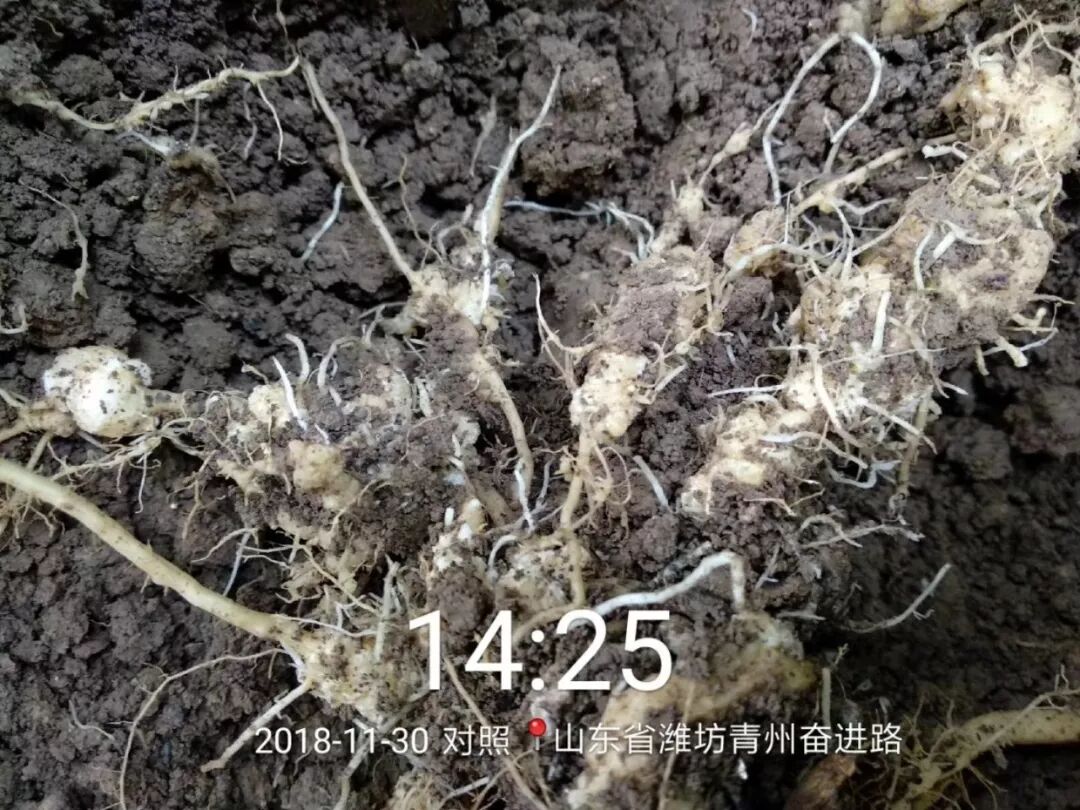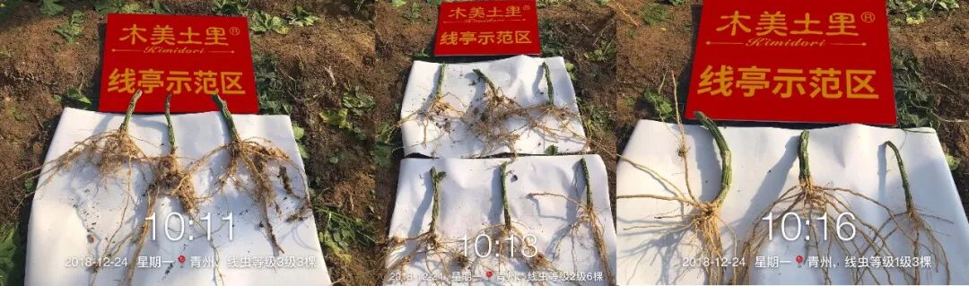使用线亭后,试验区与对照区分别选取12棵(一行),进行拔棵对比观察发现,试验组线虫发生轻微,苦瓜长势良好,不影响产量,对照组线虫发生严重。