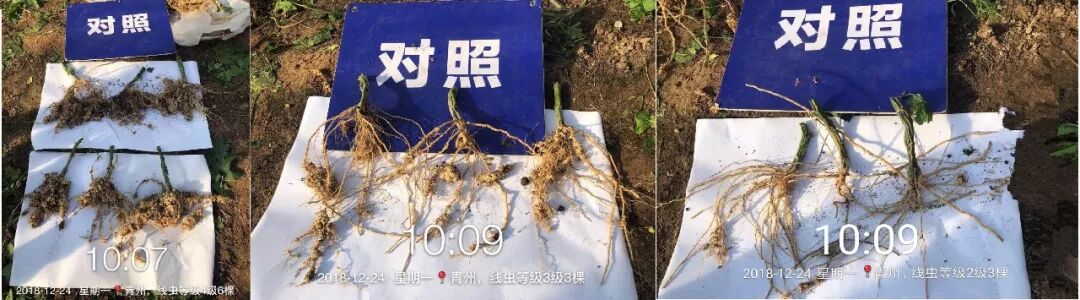 我们将试验区和对照区的线虫危害等级放在一起,对比效果十分明显。